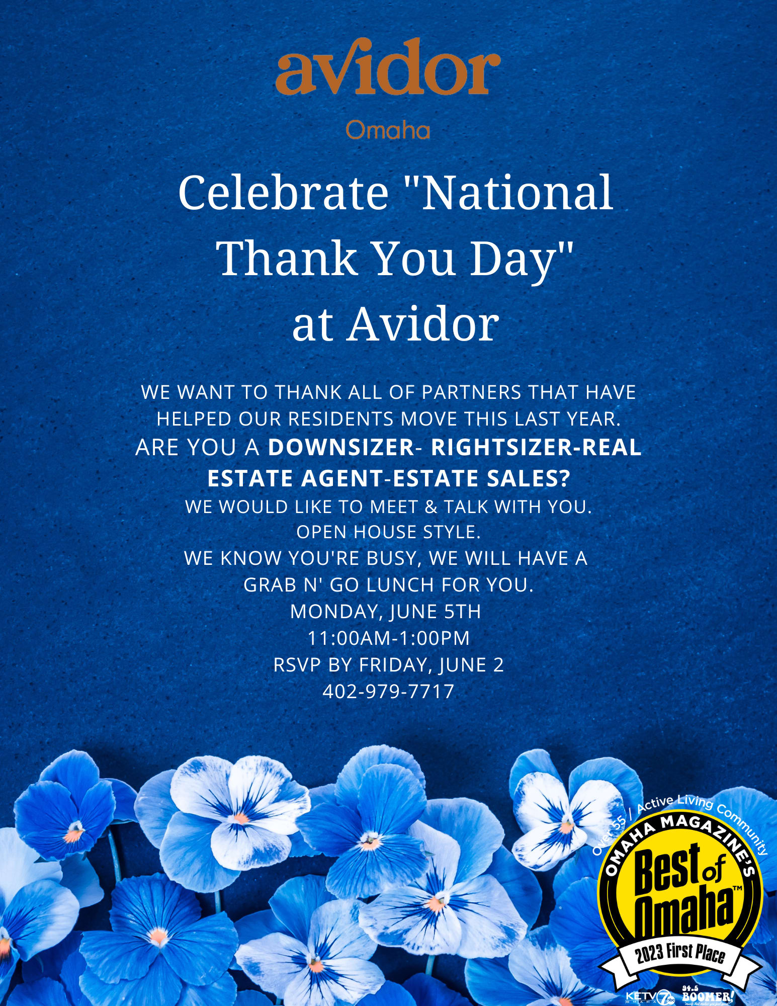 We are saying "THANK YOU" to all of our moving partners. We would like to invite down-sizers, right-sizers, real estate professionals, locators to come visit us on Monday, June 5th anytime from 11:00am-1:00pm. We will have a sack lunch for you!