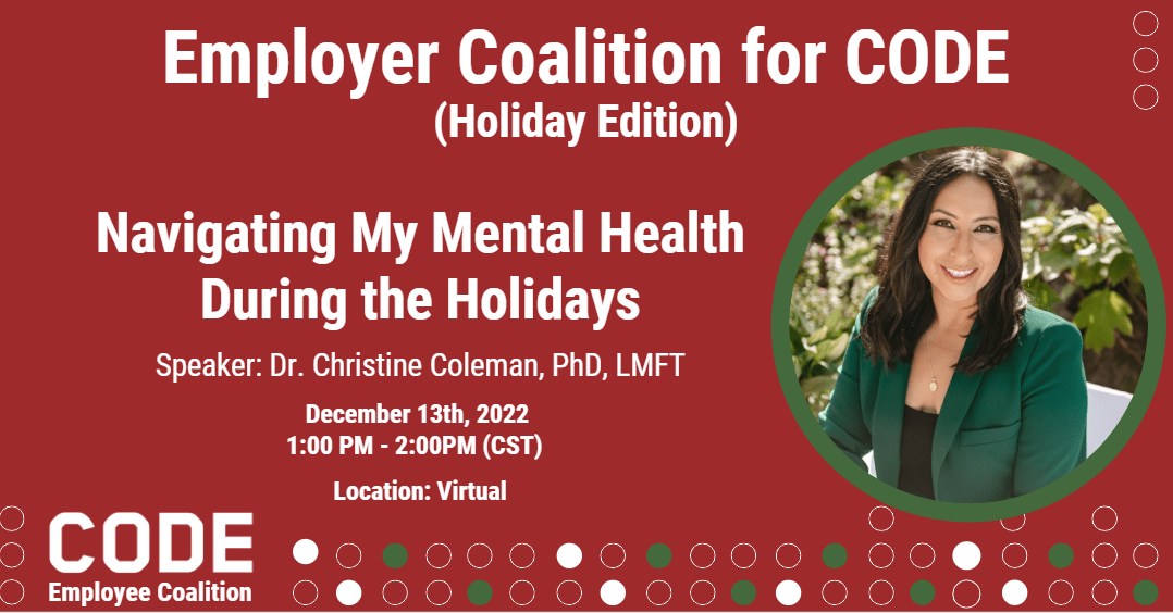 Our mental health has been collectively impacted due to the pandemic, racial unrest, climate change, among other social and personal factors. In addition, an uptick in mental health challenges during the holiday season may lead one to feel a sense of mental and emotional overwhelm. Licensed marriage and family therapist, speaker, and consultant, Dr. Christine Coleman, PhD, LMFT will support attendees in exploring the various emotional responses they may experience during the holidays. Dr. Coleman will provide a safe processing space for attendees to reflect on what they're holding internally, and will provide practical and empowering tools such as healthy boundary setting, positive affirmations, and a self-care plan.