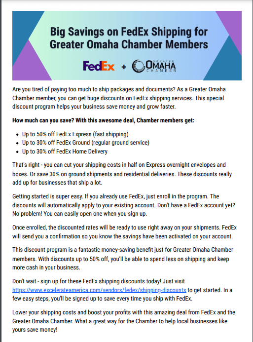 Registration Link: https://www.excelerateamerica.com/vendors/fedex/omaha-chamber-of-commerce/shipping-discounts