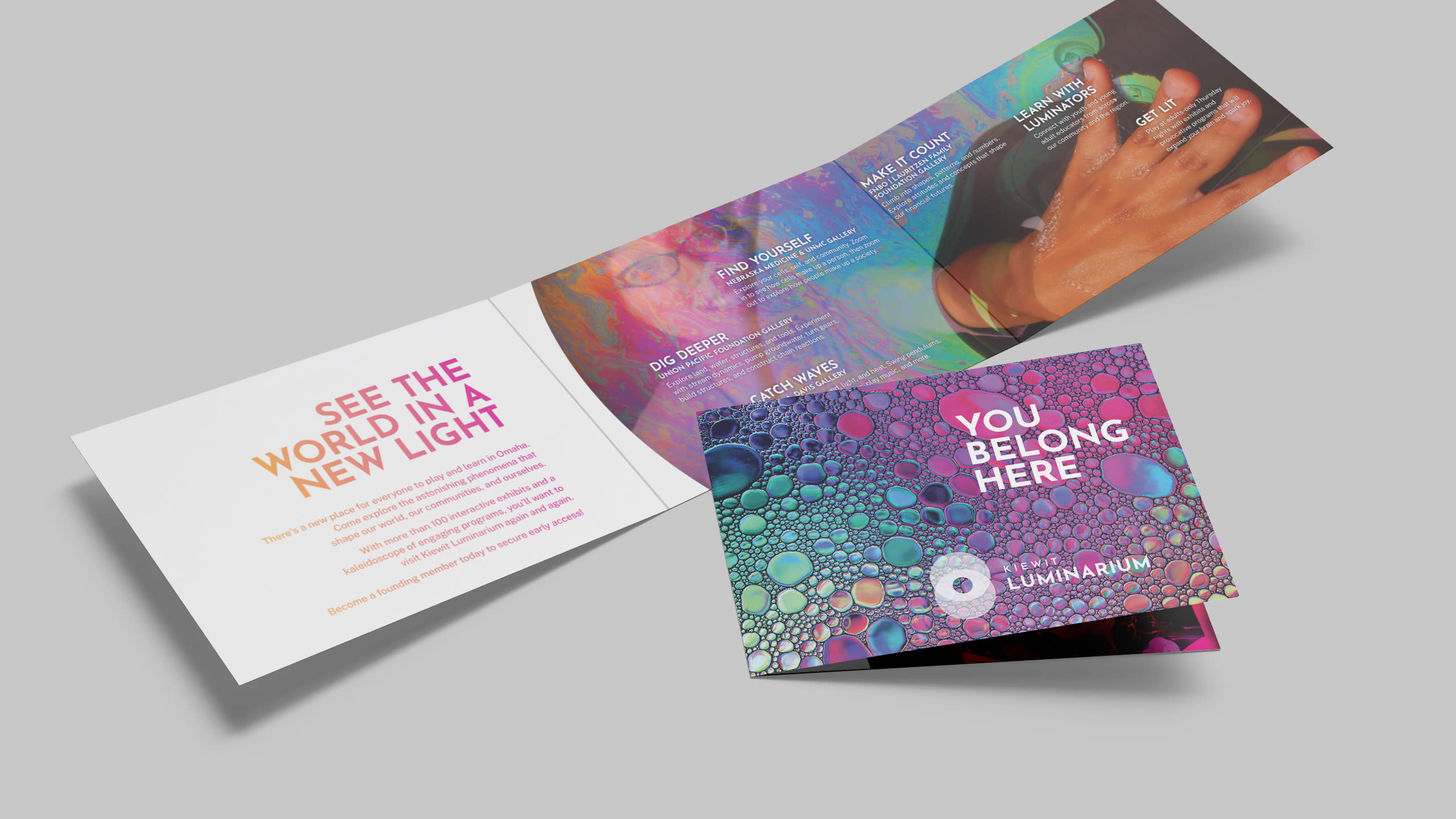 Oxide’s branding and communication design includes naming Kiewit Luminarium, holistic brand strategy, logo, signage, promotional materials, and merchandise. All aspects of the brand are designed to capture the idea that the Luminarium is a portal through which you can see into brilliant and illuminating worlds beyond.